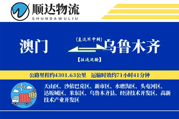 顺邦物流提供澳门至乌鲁木齐直达物流专线,全程约4301.63公里,支持整车、零担运输,价格透明,4-5天高效送达。覆盖澳门全境及乌鲁木齐天山区、沙依巴克区、新市区、水磨沟区、头屯河区、达坂城区、米东区、乌鲁木齐县、经济技术开发区、高新技术产业开发区等区域,15立方以上免费送货,专业车队保障货物安全,支持回程车调用降低运费成本。