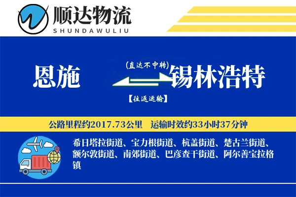 顺邦物流提供恩施至锡林浩特直达物流专线,全程约2017.73公里,支持整车、零担运输,价格透明,3-4天高效送达。覆盖恩施全境及锡林浩特希日塔拉街道、宝力根街道、杭盖街道、楚古兰街道、额尔敦街道、南郊街道、巴彦查干街道、阿尔善宝拉格镇等区域,15立方以上免费送货,专业车队保障货物安全,支持回程车调用降低运费成本。
