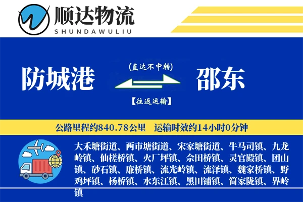 防城港到邵东物流专线是顺达物流公司提供的优质直达货运服务,全程约840.78公里,途经S7512钦防高速, G7201南宁绕城高速, G72泉南高速, G59呼北高速, S81永贺高速等多条主干道,运输时效一般为2-3天。服务范围覆盖防城港全境(如港口区、防城区、上思县、东兴市等)及邵东主要区域(大禾塘街道、两市塘街道、宋家塘街道、牛马司镇、九龙岭镇、仙槎桥镇、火厂坪镇、佘田桥镇、灵官殿镇、团山镇、砂石镇、廉桥镇、流光岭镇、流泽镇、魏家桥镇、野鸡坪镇、杨桥镇、水东江镇、黑田铺镇、简家陇镇、界岭镇等),15立方或5吨以上货物可享免费送货,不足则需加收送货费。运输价格根据货物类型和运输方式浮动,零担运输中重货参考价320-520元/吨,轻货70-110元/立方,整车运输费用按车型及货量计算,具体报价需结合货物性质、季节等因素与物流公司确认。