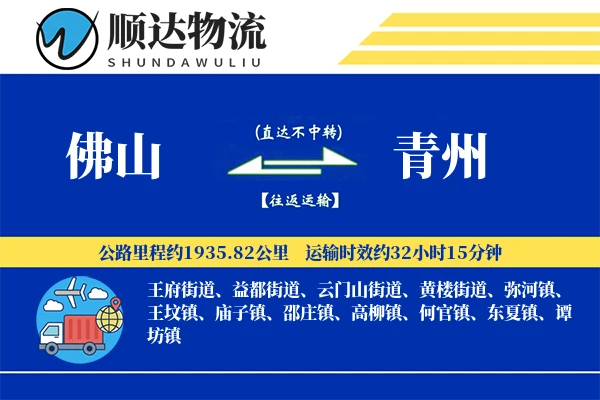 顺邦物流提供佛山至青州直达物流专线,全程约1935.82公里,支持整车、零担运输,价格透明,3-4天高效送达。覆盖佛山全境及青州王府街道、益都街道、云门山街道、黄楼街道、弥河镇、王坟镇、庙子镇、邵庄镇、高柳镇、何官镇、东夏镇、谭坊镇等区域,15立方以上免费送货,专业车队保障货物安全,支持回程车调用降低运费成本。