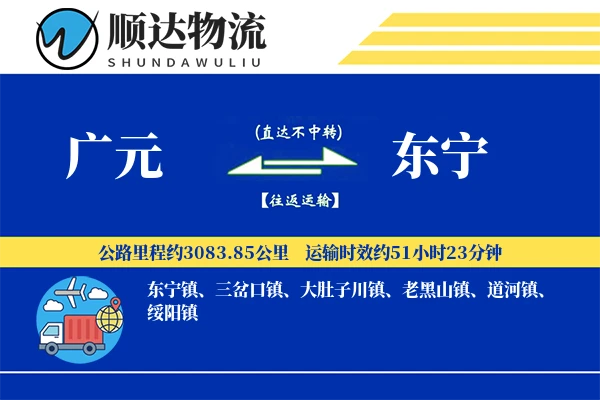 顺邦物流提供广元至东宁直达物流专线,全程约3083.85公里,支持整车、零担运输,价格透明,4-5天高效送达。覆盖广元全境及东宁东宁镇、三岔口镇、大肚子川镇、老黑山镇、道河镇、绥阳镇等区域,15立方以上免费送货,专业车队保障货物安全,支持回程车调用降低运费成本。