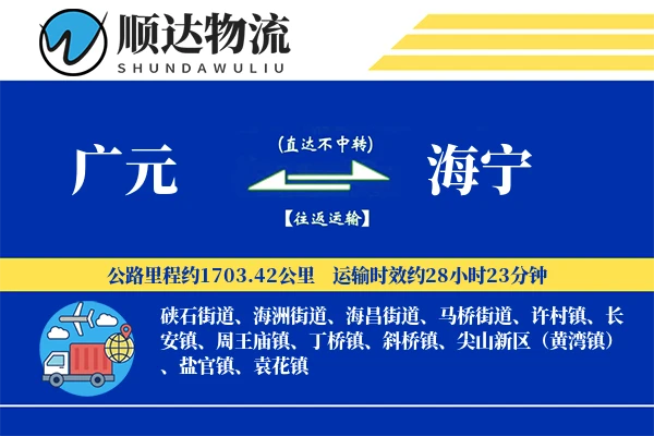 顺邦物流提供广元至海宁直达物流专线,全程约1703.42公里,支持整车、零担运输,价格透明,3-4天高效送达。覆盖广元全境及海宁硖石街道、海洲街道、海昌街道、马桥街道、许村镇、长安镇、周王庙镇、丁桥镇、斜桥镇、尖山新区(黄湾镇)、盐官镇、袁花镇等区域,15立方以上免费送货,专业车队保障货物安全,支持回程车调用降低运费成本。