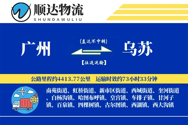 顺邦物流提供广州至乌苏直达物流专线,全程约4413.77公里,支持整车、零担运输,价格透明,5-6天高效送达。覆盖广州全境及乌苏南苑街道、虹桥街道、新市区街道、西城街道、奎河街道、白杨沟镇、哈图布呼镇、皇宫镇、车排子镇、甘河子镇、百泉镇、四棵树镇、古尔图镇、西湖镇、西大沟镇等区域,15立方以上免费送货,专业车队保障货物安全,支持回程车调用降低运费成本。