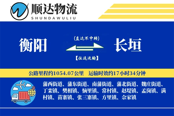 顺邦物流提供衡阳至长垣直达物流专线,全程约1054.07公里,支持整车、零担运输,价格透明,2-3天高效送达。覆盖衡阳全境及长垣蒲西街道、蒲东街道、南蒲街道、蒲北街道、魏庄街道、丁栾镇、樊相镇、恼里镇、常村镇、赵堤镇、孟岗镇、满村镇、苗寨镇、张三寨镇、方里镇、佘家镇等区域,15立方以上免费送货,专业车队保障货物安全,支持回程车调用降低运费成本。