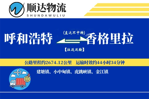 顺邦物流提供呼和浩特至香格里拉直达物流专线,全程约2674.12公里,支持整车、零担运输,价格透明,3-4天高效送达。覆盖呼和浩特全境及香格里拉建塘镇、小中甸镇、虎跳峡镇、金江镇等区域,15立方以上免费送货,专业车队保障货物安全,支持回程车调用降低运费成本。