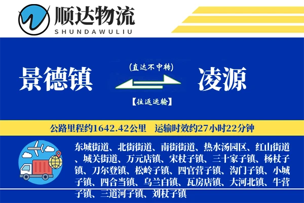 顺邦物流提供景德镇至凌源直达物流专线,全程约1642.42公里,支持整车、零担运输,价格透明,3-4天高效送达。覆盖景德镇全境及凌源东城街道、北街街道、南街街道、热水汤园区、红山街道、城关街道、万元店镇、宋杖子镇、三十家子镇、杨杖子镇、刀尔登镇、松岭子镇、四官营子镇、沟门子镇、小城子镇、四合当镇、乌兰白镇、瓦房店镇、大河北镇、牛营子镇、三道河子镇、刘杖子镇等区域,15立方以上免费送货,专业车队保障货物安全,支持回程车调用降低运费成本。