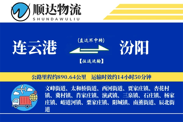 顺邦物流提供连云港至汾阳直达物流专线,全程约890.64公里,支持整车、零担运输,价格透明,2-3天高效送达。覆盖连云港全境及汾阳文峰街道、太和桥街道、西河街道、贾家庄镇、杏花村镇、冀村镇、肖家庄镇、演武镇、三泉镇、石庄镇、杨家庄镇、峪道河镇、栗家庄镇、阳城镇、南薰街道、辰北街道等区域,15立方以上免费送货,专业车队保障货物安全,支持回程车调用降低运费成本。