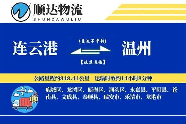 顺邦物流提供连云港至温州直达物流专线,全程约848.44公里,支持整车、零担运输,价格透明,2-3天高效送达。覆盖连云港全境及温州鹿城区、龙湾区、瓯海区、洞头区、永嘉县、平阳县、苍南县、文成县、泰顺县、瑞安市、乐清市、龙港市等区域,15立方以上免费送货,专业车队保障货物安全,支持回程车调用降低运费成本。