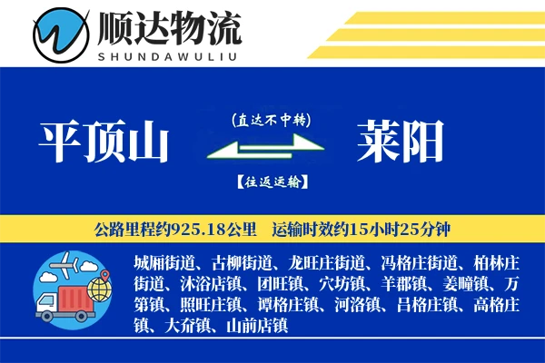 平顶山到莱阳物流专线是顺达物流公司提供的优质直达货运服务,全程约925.18公里,途经G0421许广高速, S83兰南高速, G45大广高速, S1济聊高速, G2001济南绕城高速, S16荣潍高速等多条主干道,运输时效一般为2-3天。服务范围覆盖平顶山全境(如新华区、卫东区、石龙区、湛河区、宝丰县、叶县、鲁山县、郏县、舞钢市、汝州市等)及莱阳主要区域(城厢街道、古柳街道、龙旺庄街道、冯格庄街道、柏林庄街道、沐浴店镇、团旺镇、穴坊镇、羊郡镇、姜疃镇、万第镇、照旺庄镇、谭格庄镇、河洛镇、吕格庄镇、高格庄镇、大夼镇、山前店镇等),15立方或5吨以上货物可享免费送货,不足则需加收送货费。运输价格根据货物类型和运输方式浮动,零担运输中重货参考价350-550元/吨,轻货80-120元/立方,整车运输费用按车型及货量计算,具体报价需结合货物性质、季节等因素与物流公司确认。