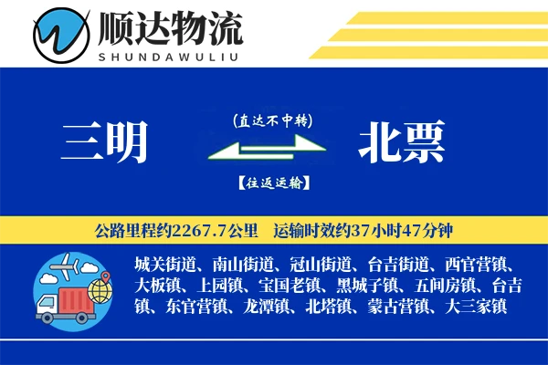 顺邦物流提供三明至北票直达物流专线,全程约2267.7公里,支持整车、零担运输,价格透明,3-4天高效送达。覆盖三明全境及北票城关街道、南山街道、冠山街道、台吉街道、西官营镇、大板镇、上园镇、宝国老镇、黑城子镇、五间房镇、台吉镇、东官营镇、龙潭镇、北塔镇、蒙古营镇、大三家镇等区域,15立方以上免费送货,专业车队保障货物安全,支持回程车调用降低运费成本。