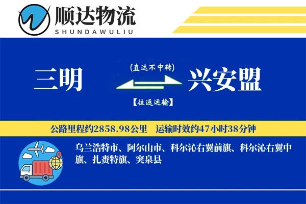 顺邦物流提供三明至兴安盟直达物流专线,全程约2858.98公里,支持整车、零担运输,价格透明,3-4天高效送达。覆盖三明全境及兴安盟乌兰浩特市、阿尔山市、科尔沁右翼前旗、科尔沁右翼中旗、扎赉特旗、突泉县等区域,15立方以上免费送货,专业车队保障货物安全,支持回程车调用降低运费成本。