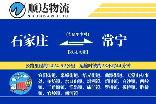 顺邦物流提供石家庄至常宁直达物流专线,全程约1424.52公里,支持整车、零担运输,价格透明,2-3天高效送达。覆盖石家庄全境及常宁宜阳街道、泉峰街道、培元街道、曲潭街道、天堂山办事处、柏坊镇、水口山镇、烟洲镇、荫田镇、白沙镇、西岭镇、三角塘镇、洋泉镇、庙前镇、罗桥镇、板桥镇、胜桥镇、官岭镇、新河镇等区域,15立方以上免费送货,专业车队保障货物安全,支持回程车调用降低运费成本。