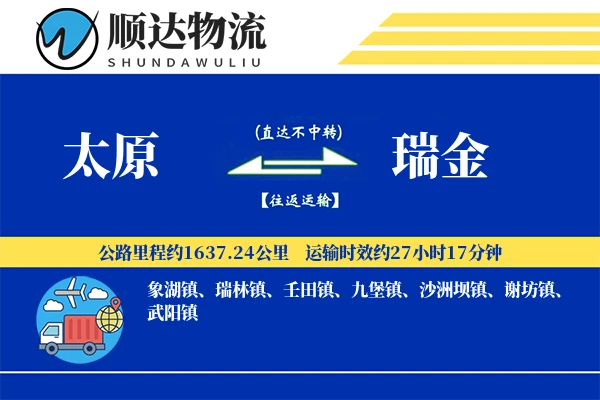 顺邦物流提供太原至瑞金直达物流专线,全程约1637.24公里,支持整车、零担运输,价格透明,3-4天高效送达。覆盖太原全境及瑞金象湖镇、瑞林镇、壬田镇、九堡镇、沙洲坝镇、谢坊镇、武阳镇等区域,15立方以上免费送货,专业车队保障货物安全,支持回程车调用降低运费成本。