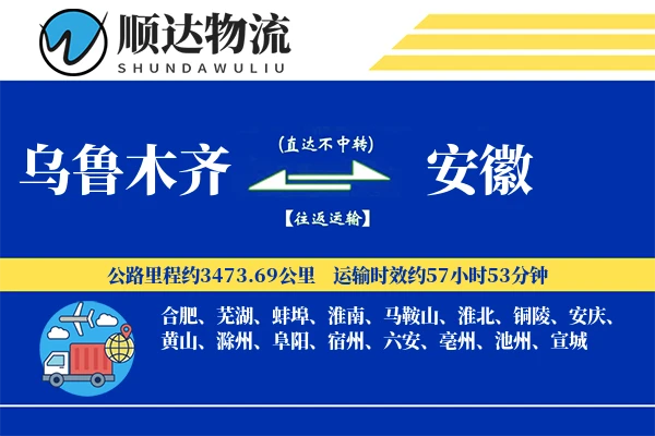 顺邦物流提供乌鲁木齐至安徽直达物流专线,全程约3473.69公里,支持整车、零担运输,价格透明,4-5天高效送达。覆盖乌鲁木齐全境及安徽合肥、芜湖、蚌埠、淮南、马鞍山、淮北、铜陵、安庆、黄山、滁州、阜阳、宿州、六安、亳州、池州、宣城等区域,15立方以上免费送货,专业车队保障货物安全,支持回程车调用降低运费成本。