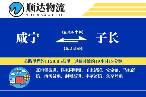 顺邦物流提供咸宁至子长直达物流专线,全程约1158.05公里,支持整车、零担运输,价格透明,2-3天高效送达。覆盖咸宁全境及子长瓦窑堡街道、杨家园则镇、玉家湾镇、安定镇、马家砭镇、南沟岔镇、涧峪岔镇、李家岔镇、余家坪镇等区域,15立方以上免费送货,专业车队保障货物安全,支持回程车调用降低运费成本。