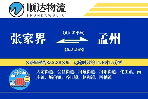 顺邦物流提供张家界至孟州直达物流专线,全程约855.38公里,支持整车、零担运输,价格透明,2-3天高效送达。覆盖张家界全境及孟州大定街道、会昌街道、河雍街道、河阳街道、化工镇、南庄镇、城伯镇、谷旦镇、赵和镇、西虢镇等区域,15立方以上免费送货,专业车队保障货物安全,支持回程车调用降低运费成本。